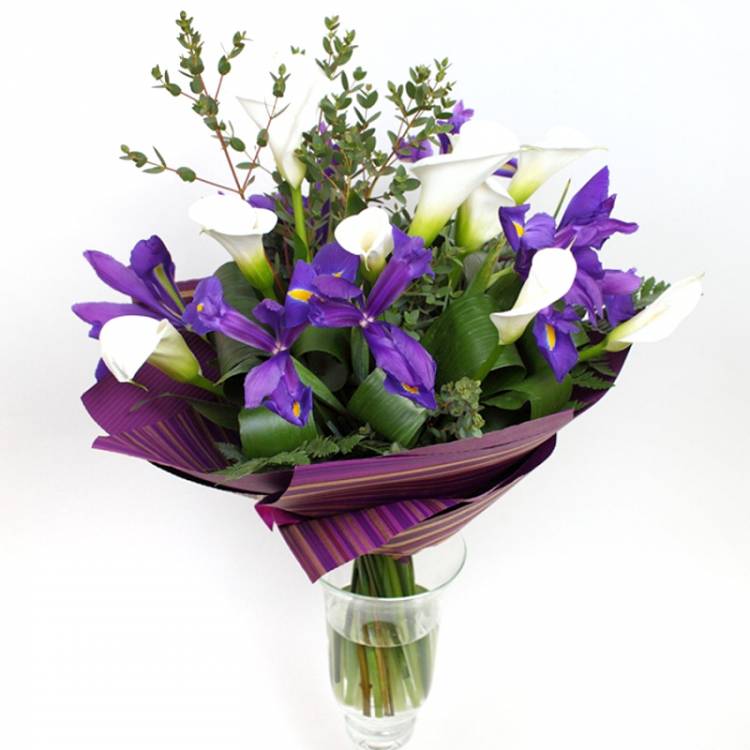 Нежные фиолетовые ирисы погрузят вас в атмосферу таинственности летнего сумрака. Контрастирующие с ними белые каллы добавят шарма и нежности. На языке цветов каллы – кротость, ирисы – дружба, мудрость и вера. Гармонично добавленные эвкалипт, аспедистра и папоротник создают общую непринужденность композиции. Букет идеально подойдет как знак выражение дружбы или глубокой привязанности к близкому человеку.